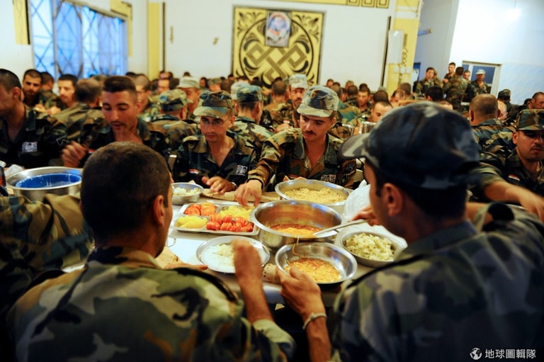 一群軍人在結束一天的齋戒後,享用開齋飯。
