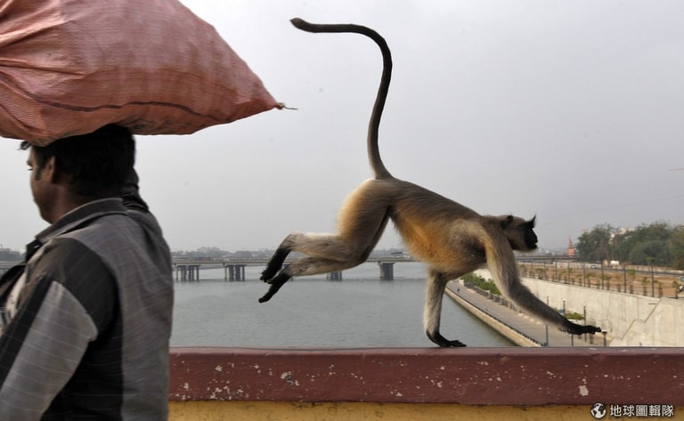 一隻猴子跑過位於薩巴爾馬蒂河(Sabarmati river)上的大橋。