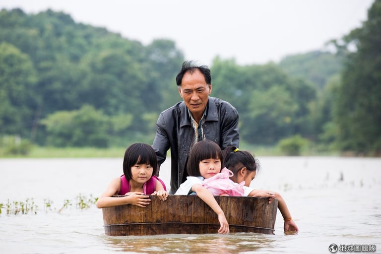 在江西省都昌縣,當地正受洪水所苦,一名男子用浴盆來接小孩下課,讓他們坐在盆中回家。