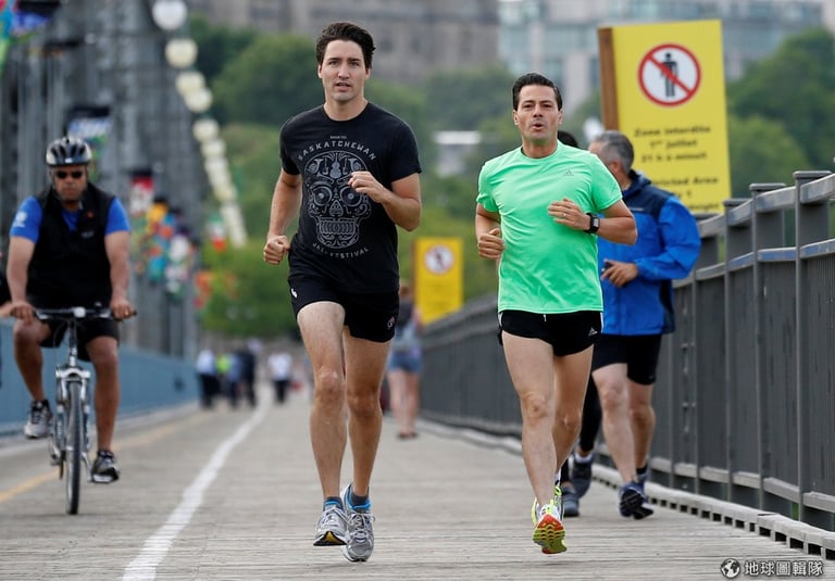 加拿大總理杜魯道(Justin Trudeau,左)和墨西哥總統涅托(Enrique Pena Nieto)跑過橫跨渥太華和加蒂諾的亞歷山德拉大橋(Alexandra Bridge)。