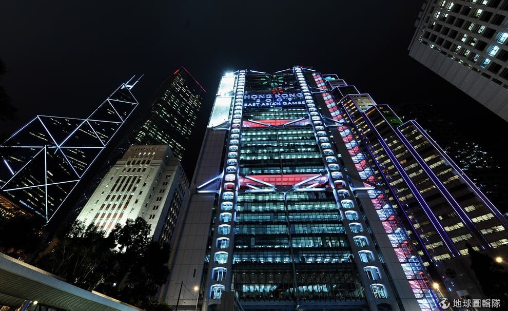 當地的HSBC大樓在夜色中綻放光芒。Stuart Franklin/Getty Images