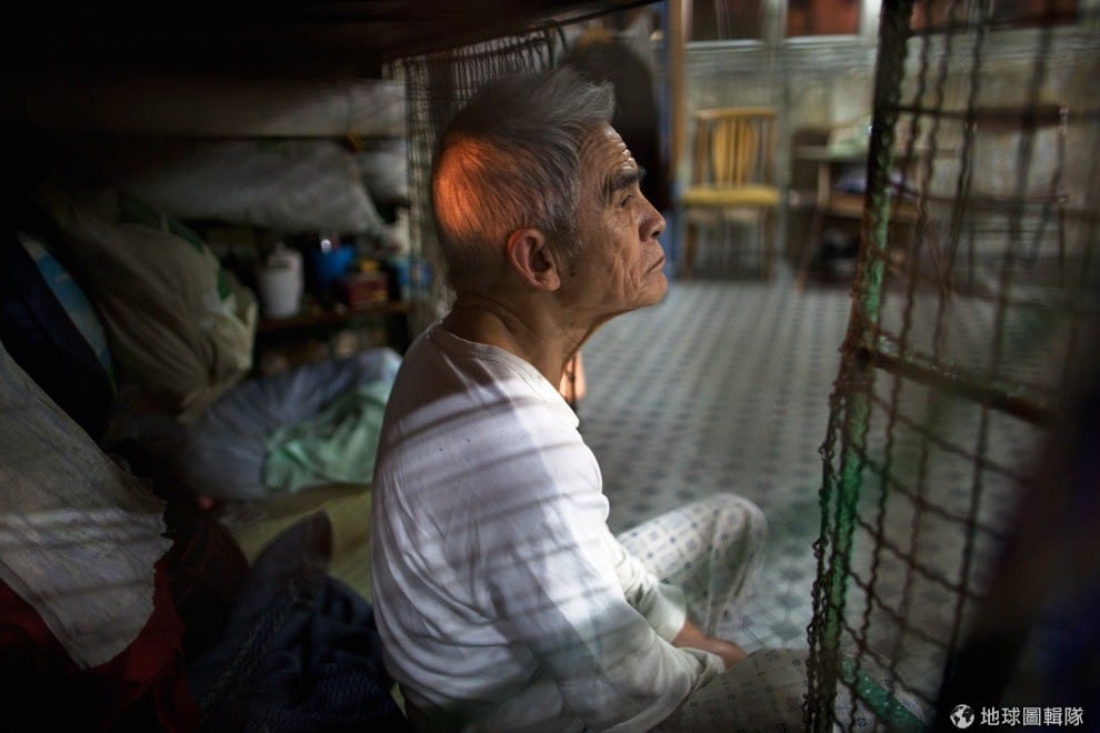 78歲的蘇良(Leung Shu,音譯)茫然地看著「屋」外,2010年不斷新蓋的大樓威脅到老舊房舍,他和其他一樣住在「籠屋」(Cage Dwelling)的人被迫到他處找低廉的地方棲身。Daniel Berehulak/Getty Images