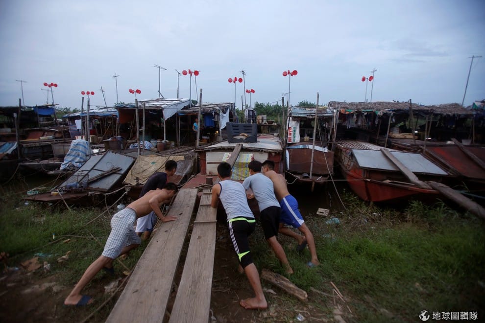 河內市區內一處水上村落中,居民們正一起推著木船,這一處水上村落依靠風力來維持基本日常生活運作。