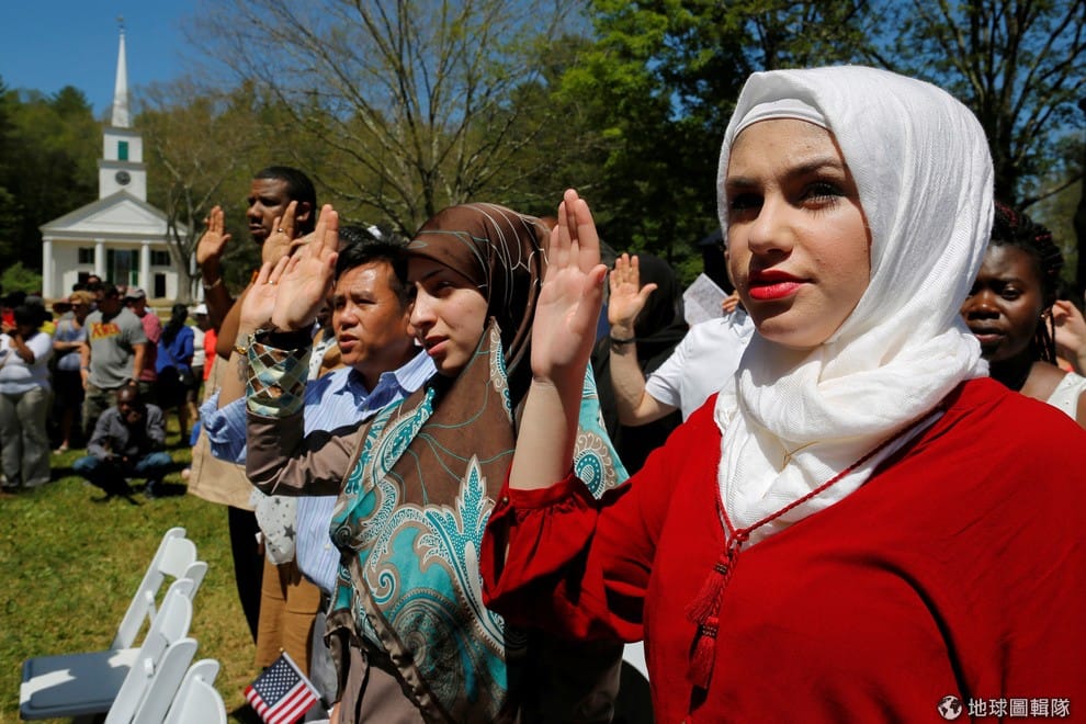 伊拉克人阿爾哈拉克(Hala Alhallaq,圖右)舉手宣誓,她與其他 145名非美國籍民眾一同在 4號這天參加美國公民儀式,正式取得美國公民身分。