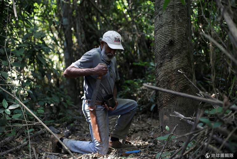 71歲的德巴洛斯(Raimundo Mendes de Barros)正劃開橡膠樹。在橡膠工廠做了 57個年頭的他近日為了巴西奧運要準備好的大量保險套趕工中。