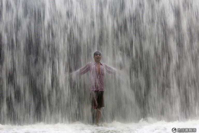 孟買當地的寶懷湖(Powai lake)因大雨讓湖水從一旁的水壩流瀉而出,一位民眾站湖水下興奮大笑。