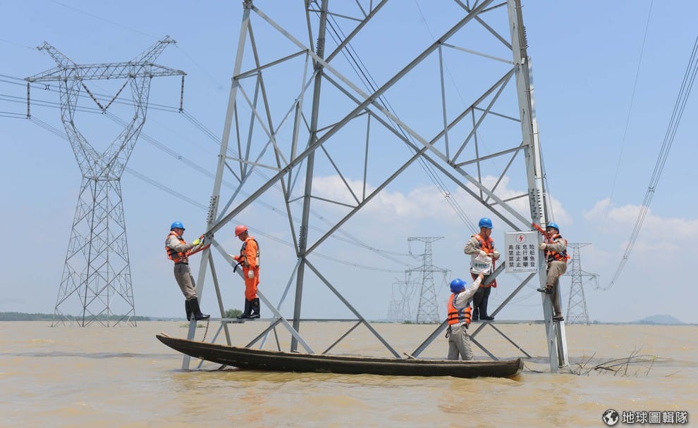 安徽宣城市內,尼伯特颱風讓當地淹大水,電力人員在漫漫大水中確認高壓電塔的設施是否夠堅固。