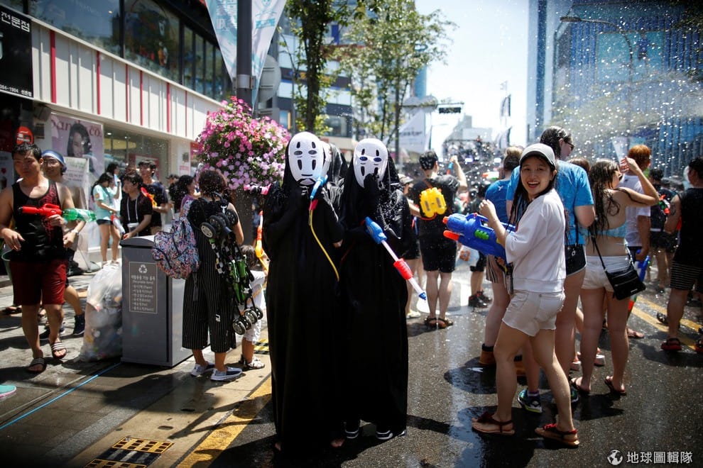首爾新村區正舉辦「新村水槍節」,其中可見參加民眾特意打扮成動畫《神隱少女》中人物「無臉男」的模樣。