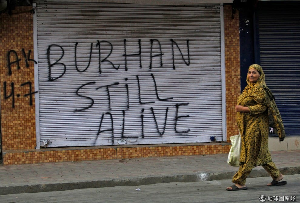 喀什米爾地區中的斯里納加(Srinagar)正進行宵禁,一位民眾走過噴有字樣:「瓦尼(Burhan Wani)仍活著」的塗鴉,當地民眾正在哀悼日前與維安部隊衝突喪生的激進領導人瓦尼。瓦尼是喀什米爾地區歷史最久的武裝組織「神聖戰士黨」(Hizb-ul-Mujahideen)的指揮官。