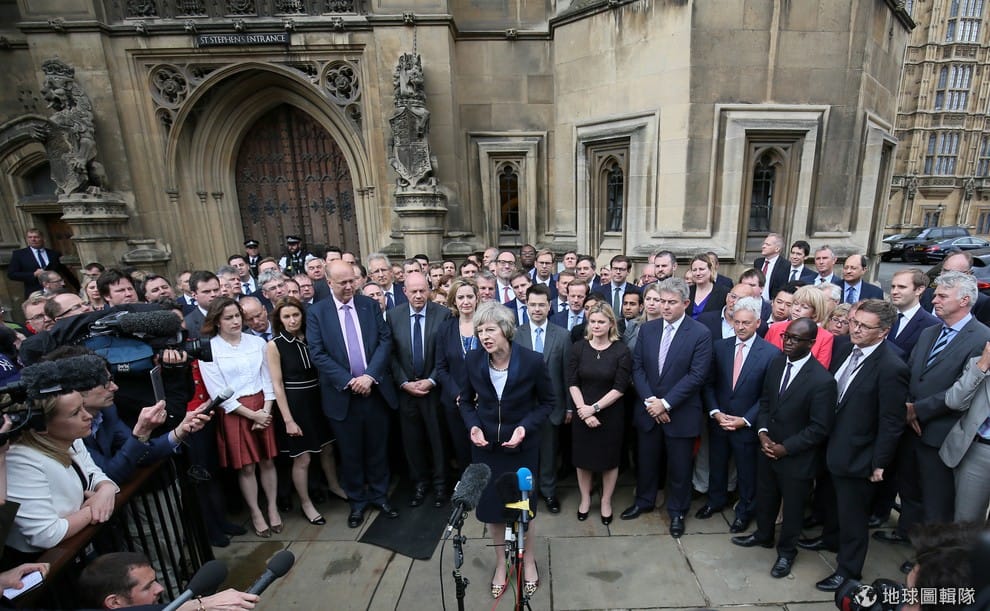 11號這天,確認成為新任英相的梅伊(Theresa May),在國會前和成群保守黨議員一起接受媒體採訪。