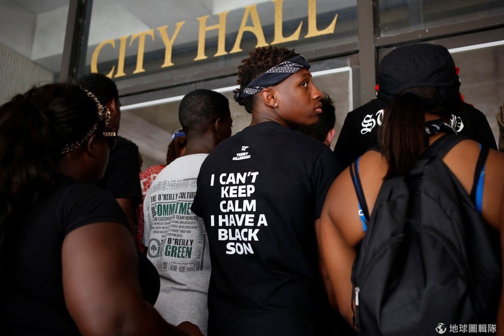 路易斯安那州當地,民眾站在市政廳前抗議,其中一人的背上寫著「我無法冷靜,因為我兒子是黑人」。