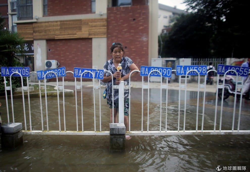 湖北省武漢當地,一名婦人拿著她從大水中撿起的車牌,等待車主跟她買回去。
