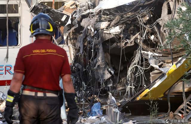 消防人員站在撞毀的列車前。義大利南部普利亞地區(Puglia)發生兩列火車相撞事件,至少有 12人喪生和數十人受傷。