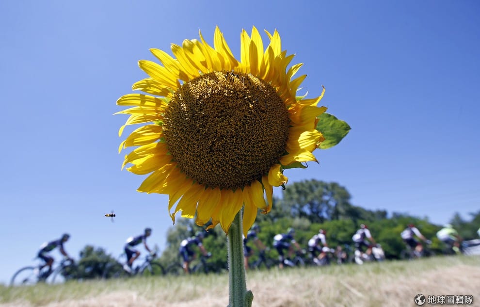 法國東部欣欣向榮的向日葵花田旁,一排參與環法自行車賽的選手騎車經過。