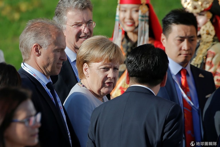 首都烏蘭巴托當地,準備參與亞歐會議(ASEM)的德國總理梅克爾(Angela Merkel)和一旁人員談話,她的身後可以看到身穿傳統服飾的蒙古迎賓人員。