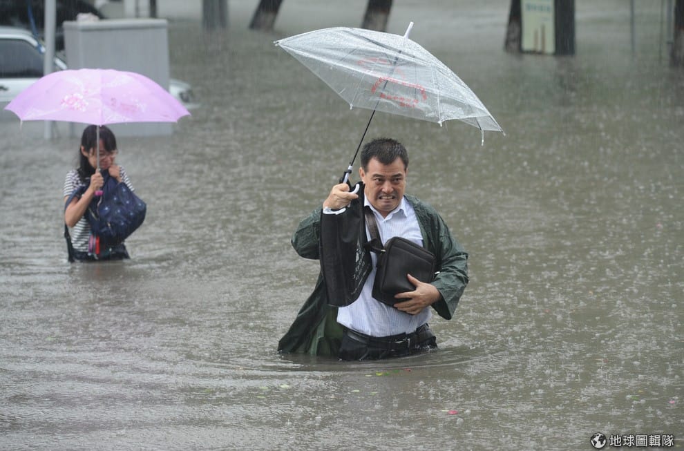 民眾舉起傘,抱好包包,涉水離開已經淹到腰部的區域,這裡是山西省的太原市,因為連日豪大雨的關係洪水淹進市區,讓當地成為一片汪洋。