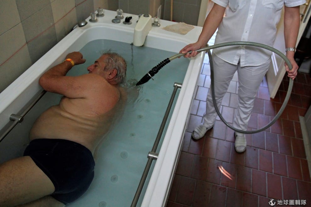 在首都布達佩斯的盧卡奇浴場(Lukacs Bath),一名男子躺在浴缸中接受水療,這裡提供各式各樣的水療服務,除了能助人放鬆外,也能舒緩民眾緊繃的肌肉,受到當地人的喜愛,也是炎炎夏日消暑的好選擇。