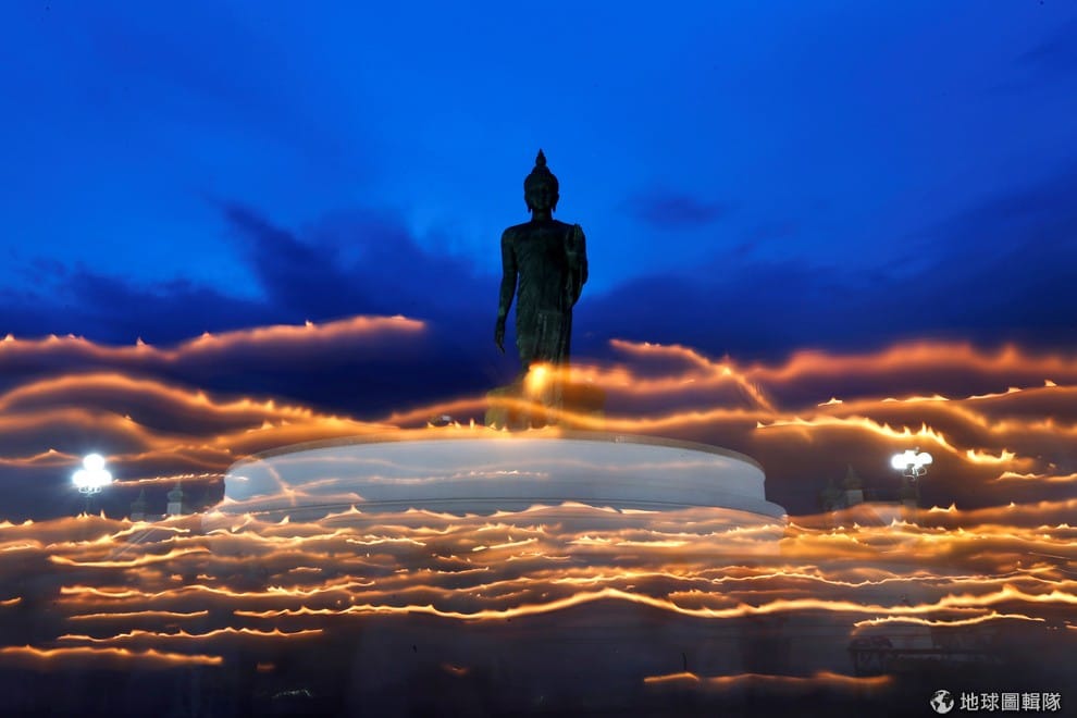 僧侶們手拿蠟燭,在阿薩哈聖法節 (Asalha Puja)這天繞著大型佛像行走。阿薩哈聖法節又稱三寶佛節,這個節日通常於七月慶祝,紀念佛陀得道後第一次講道,向五位賢者傳達佛教的奧義。