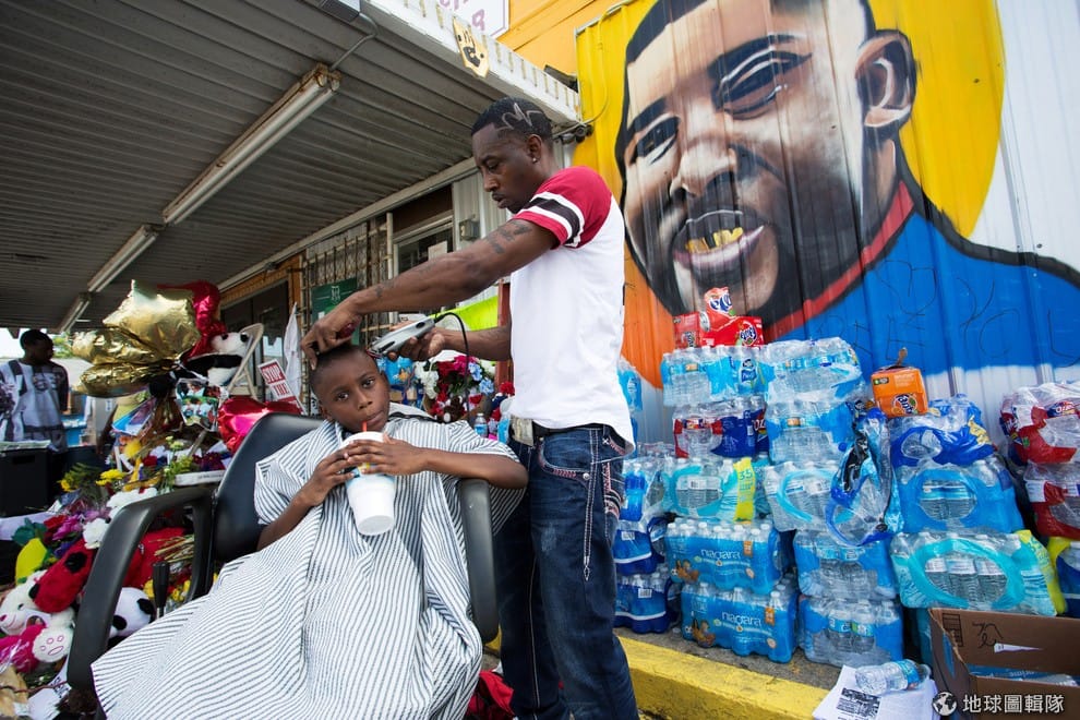 一名小男孩坐在椅子上給人理髮,這裡是路易斯安那州的巴頓魯治(Baton Rouge),當地居民舉辦了「為正義理髮」的活動,希望可以為被白人警察射殺的黑人小販史特林(Alton Sterling)討公道,理髮師的身後正是史特林的畫像。