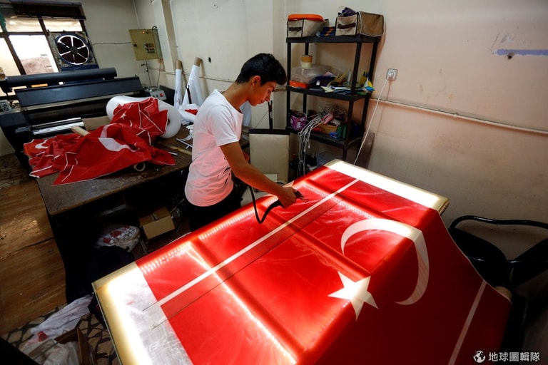 一名員工手拿工具,專心地生產土耳其國旗,這裡是一間國旗製造工廠,後頭堆著土耳其國旗的樣品。