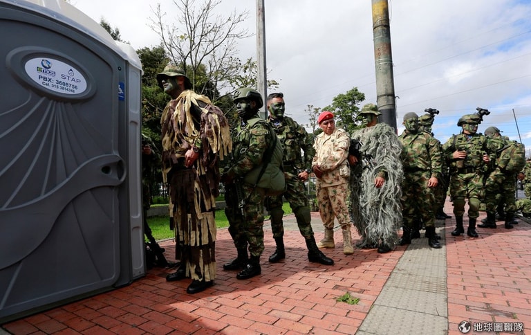 一排全副武裝的軍人,在首都波哥大的流動廁所外排隊,他們正在當地參加第 206屆哥倫比亞獨立宣言紀念儀式,紀念哥倫比亞從西班牙獨立獲得主權,然而,獨立後的哥倫比亞因革命軍和政府衝突導致內戰不斷。