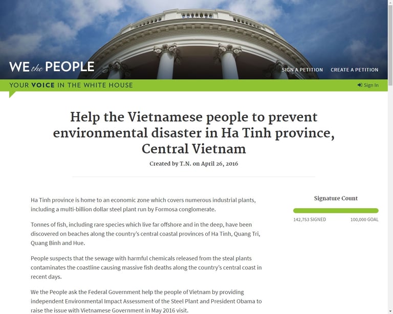 同一日,越南網民在白宮網路連署網站「We the People」上連署「Help the Vietnamese people to prevent environmental disaster in Ha Tinh province, Central Vietnam (幫助越南人民阻止發生在越南中部河靜省的環境災難)」,矛頭直指台塑集團,認為是河靜鋼鐵公司排放有毒化學廢水導致此災難。此舉是希望將於五月訪越的歐巴馬總統能與越南政府高層就這個議題進行討論。