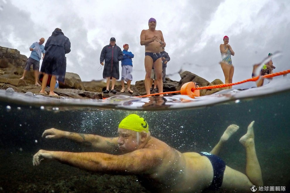 一名馬魯巴冬季海豹游泳俱樂部(Maroubra Winter Seals swimming club)的成員站在岸上準備跳下水,他的同伴早已悠游在海中,時值澳洲冬季,寒冷的低溫擋不住泳客的雄心。