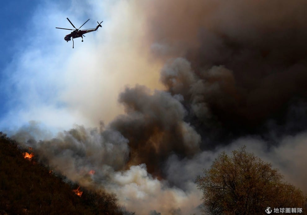 消防人員正在跟加州森林大火奮戰,一架消防直升機飛上天探察火勢。