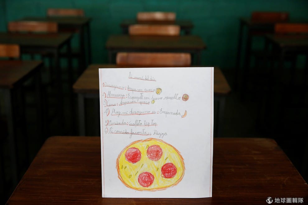 一名小學生在作業簿上和大家報告他一天三餐都吃什麼,他寫道:「早餐吃了起司玉米餅,中午吃了加了蛋的義大利麵,晚餐吃了一片餅乾。」而該名小學生也在作業簿上畫下他最喜歡的餐點,那就是披薩。