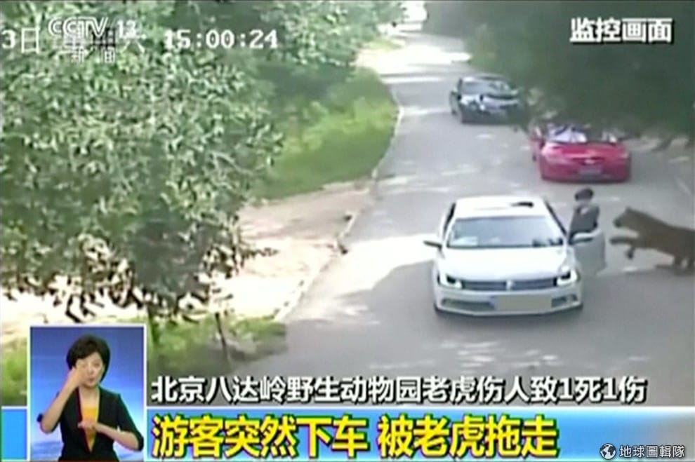 監視器的畫面拍到,在北京八達嶺野生公園內,一隻老虎接近打開車門下車的女子,準備將她拖走,隨後老虎傷人事件導致一死一傷。