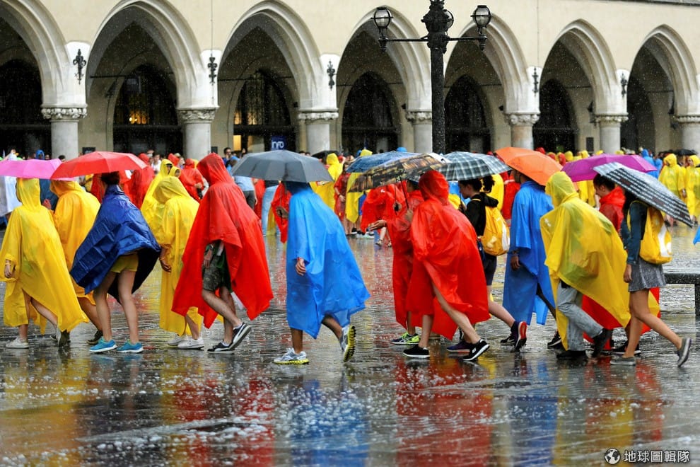 一群穿著五顏六色雨衣的年輕教徒,撐傘前往會場參加一年一度由天主教會主辦的世界青年日(World Youth Day)。
