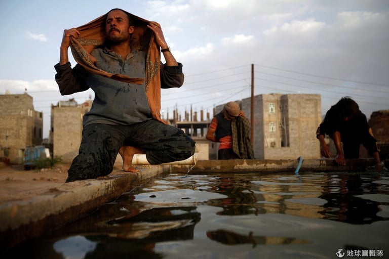 在首都沙那外圍的磚塊工廠,勞工們靠在水池邊洗掉身上的塵土。
