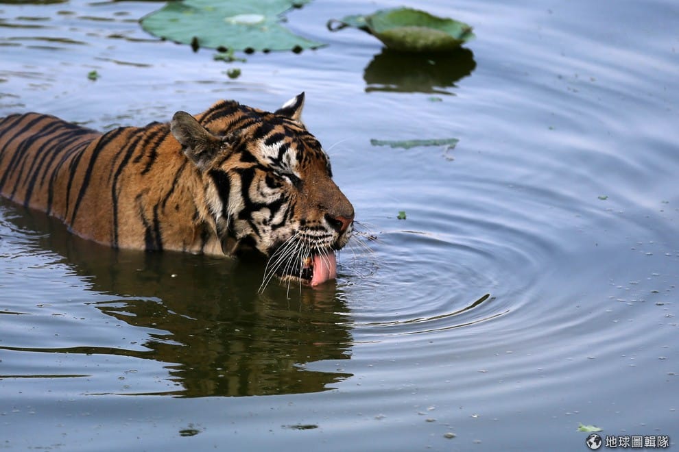 一隻動物園的老虎待在水池中消暑。除了清涼的水池,有的動物園也會特地為動物們製作冰棒和大型冰塊,讓動物們可以趴在冰塊上大吃冰棒,趕走炎熱的夏日。