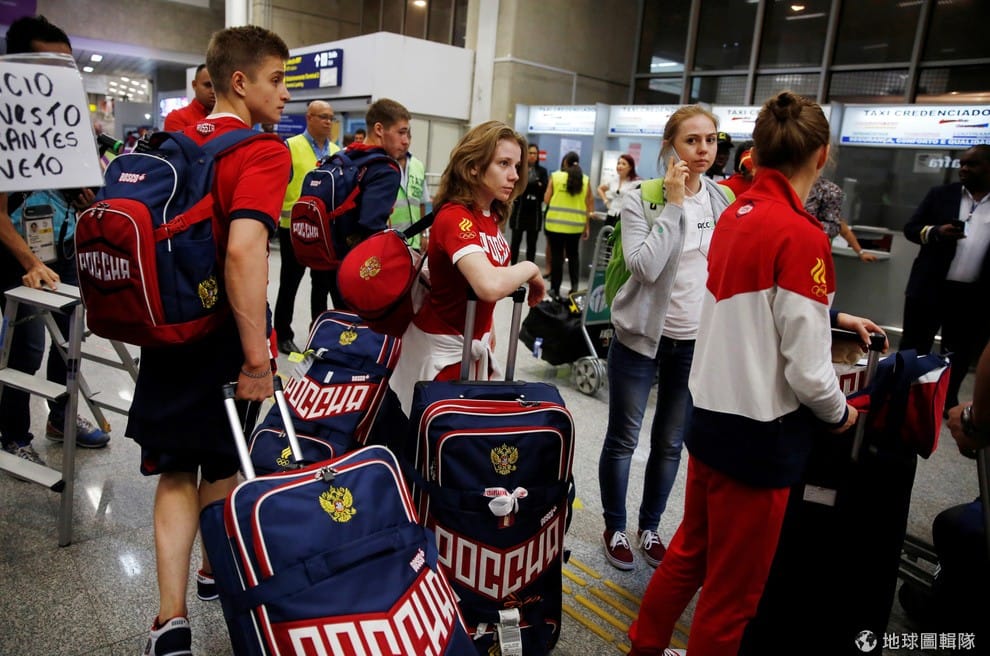 路透社俄國奧運代表隊已經抵達主辦國巴西,他們在里約國際機場等待接駁巴士,準備前往下榻處休息。