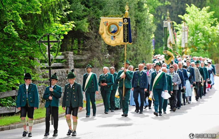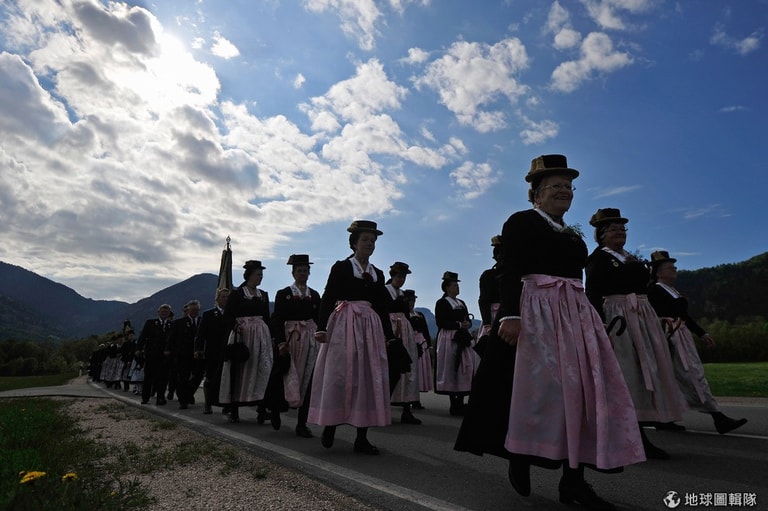 男男女女都穿上巴伐利亞傳統服飾, 一同隨著高舉的耶穌像前進。Lennart Preiss/Getty Images