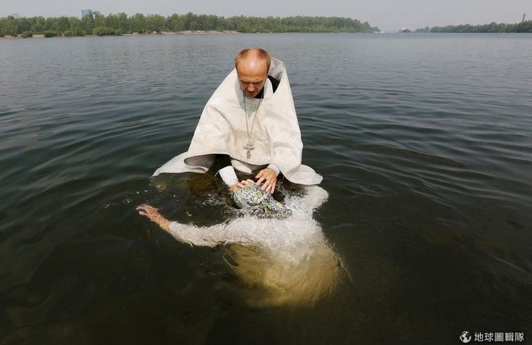 一名東正教神父將信徒的頭按進葉尼塞河的水中,幫她受洗成教徒。