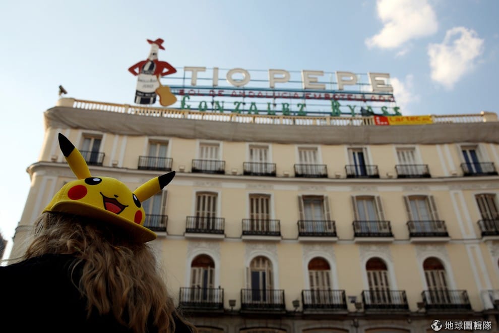 一名女子頭戴《精靈寶可夢》主角皮卡丘的帽子,來到馬德里太陽門廣場玩擴增實境遊戲,享受在現實世界中當一名精靈寶可夢訓練師的滋味。