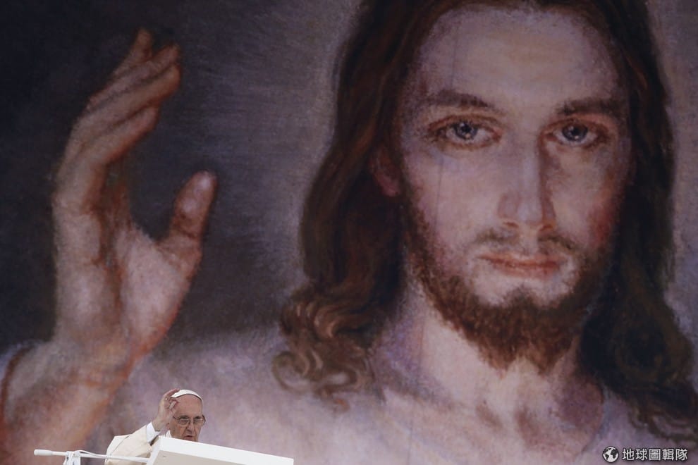 羅馬天主教宗方濟各(Pope Francis)現身世界青年日(World Youth Day)的活動現場,在大幅的耶穌畫像前向台下的青年演講。