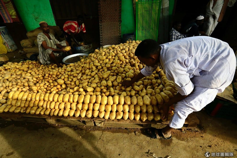 一名馬鈴薯小販在首都喀土木(Khartoum)的市場內,把一顆顆馬鈴薯排列整齊,準備迎接上門的客人。