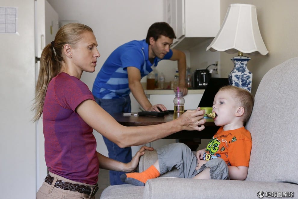 來自俄國的田徑選手史戴拋諾娃(Vitaly&Yuliya Stepanova)夫婦正在餵他們的孩子吃飯。