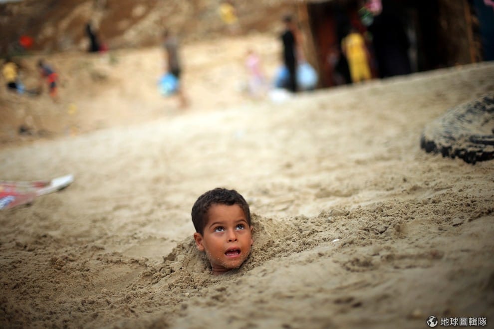 一名小男孩在難民營旁的海灘玩耍,他把全身埋在沙子中,只露出一顆頭在外面。