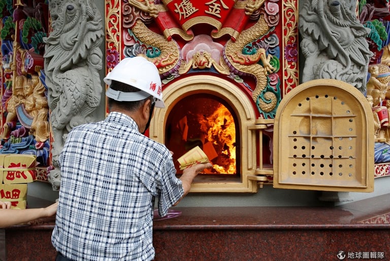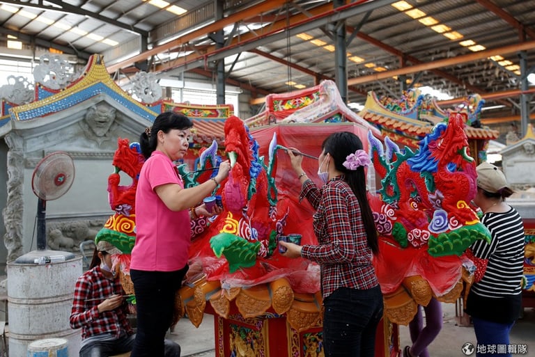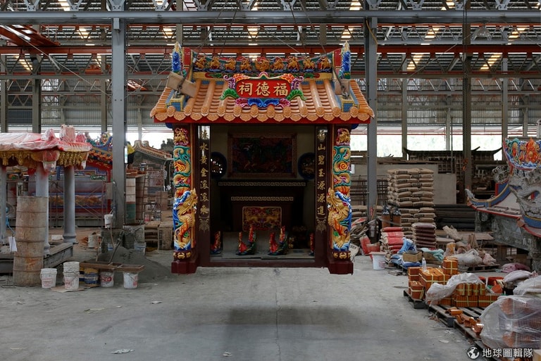 台灣屏東縣南州鄉,今年 78歲的老闆林復準戴著白色安全帽走在工廠中,他向一旁的《路透社》記者介紹自己的移動廟工廠。