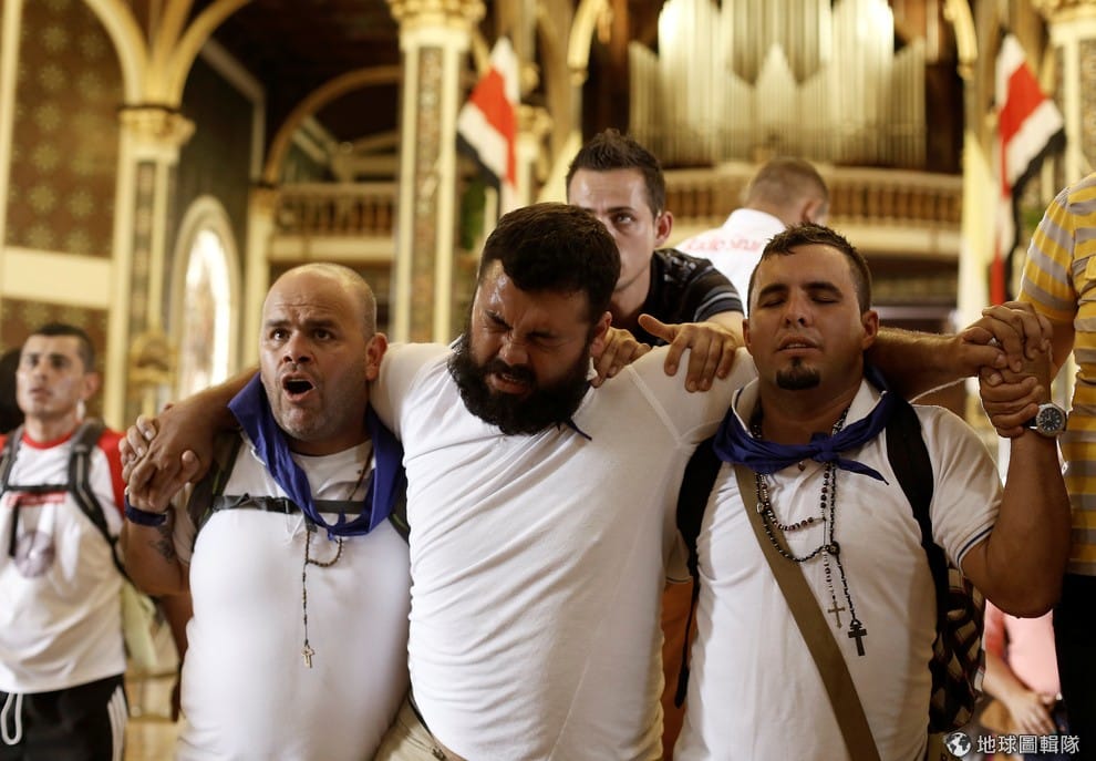 完成朝聖之旅的信眾在其他人的扶持下走進聖母大教堂(Basilica of Los Angeles)。8月2日是當地的國定假日聖母日(Virgin of Los Angeles)。