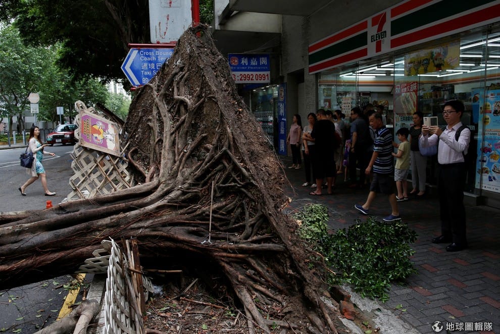妮妲颱風過境香港,市區內可見大樹禁不起風吹被連根拔起。