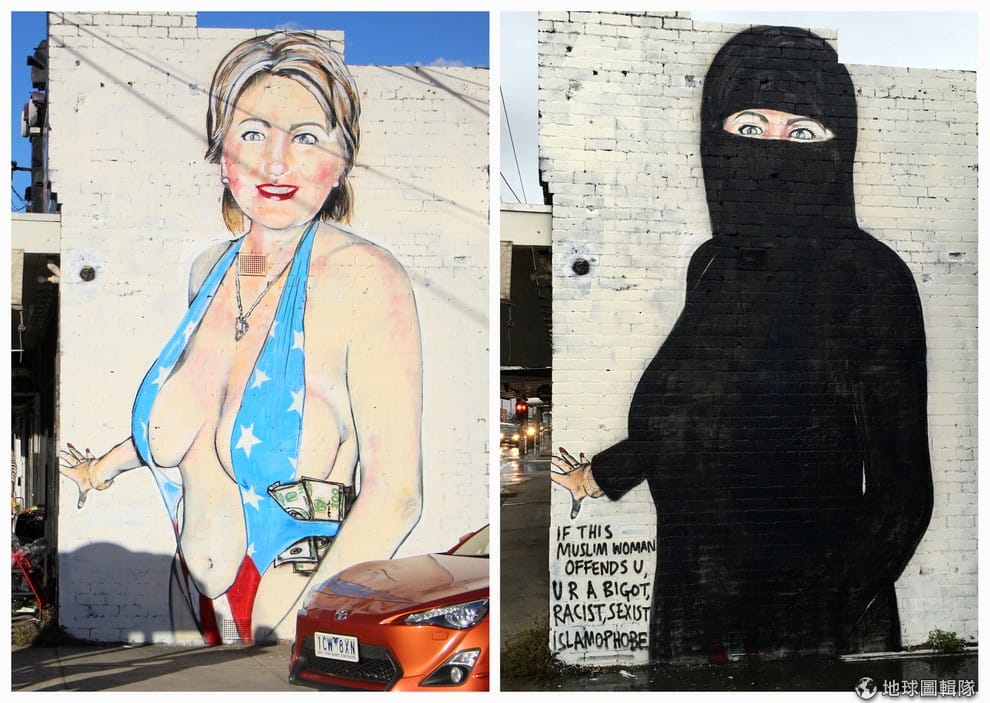 澳洲墨爾本Footscray區最近出現美國民主黨總統候選人希拉蕊(Hillary Clinton)身穿比基尼的塗鴉,這是當地藝術家Lushsux的作品,但因為引發爭議遭當地議會要求移除,Lushsux便在 1號時為壁畫「添衣」,希拉蕊變為穿罩袍的回教女性。