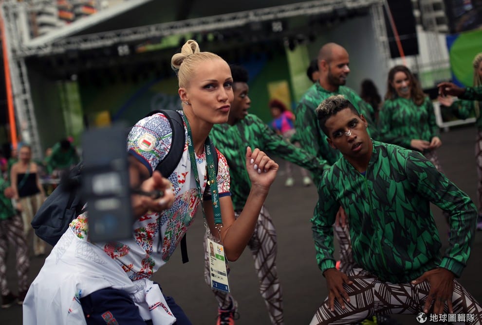 里約熱內盧的奧運選手村中,挪威選手舉起自拍棒與其他人合影。