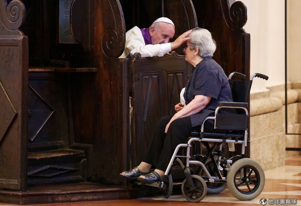 阿西西市當地,教宗方濟各(Pope Francis)專心聽著信眾的懺悔。