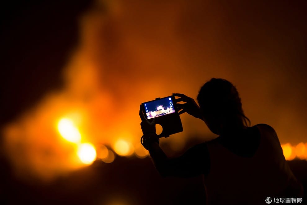 民眾用手機拍下遠處的山林大火,報導指出,這場發生在拉帕爾馬島(La Palma)上的大火據稱是一名德國遊客點燃衛生紙而引發,目前已知大火釀成一名森林巡邏員身亡。