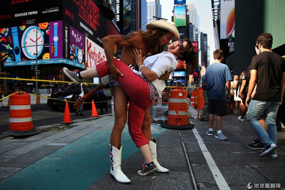 時代廣場上知名的街頭藝人「裸體牛仔」伯克(Robert Burck),他正與前來拍照的遊客合影。伯克是一名美國街頭藝人及紐約時報廣場的標誌性人物,他的形象包括:彈奏吉他、只穿著白色的短內褲、牛仔靴和牛仔帽,並提著一支寫滿有關赤踝內容的吉他。
