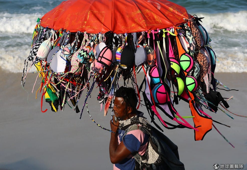 里約熱內盧海邊,一名兜售比基尼的小販走過沙灘。
